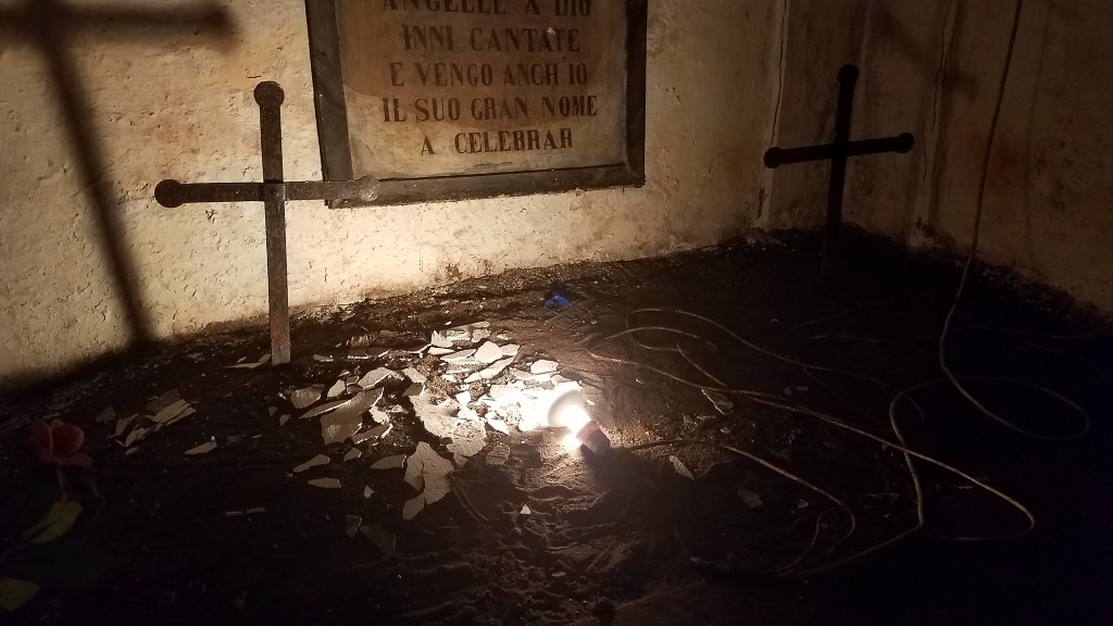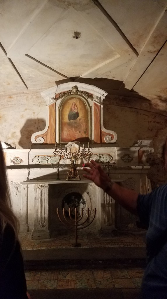 These beliefs are very ancient and belong to a larger tradition of death rituals called “Naccarata”, the funeral songs. It was common in the Middle Ages in Italy to believe in La Madonna as the guide of souls on her underworld boat, guiding the dead to their final resting place. It was a pleasure to see this preserved in stone at the Chiesa of La Madonna Delle Neve. As I was told by archeologist Armando Mei, this chamber is shaped like an upside-down boat, which reflects the overlapping of worlds and the voyage to the afterlife.